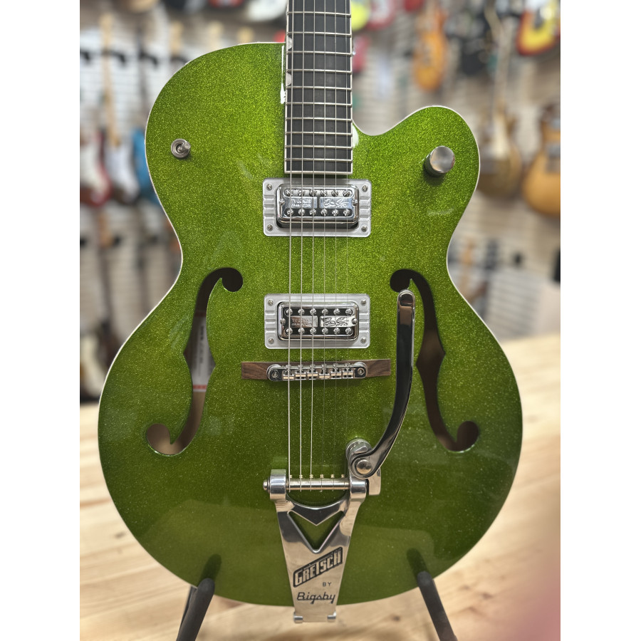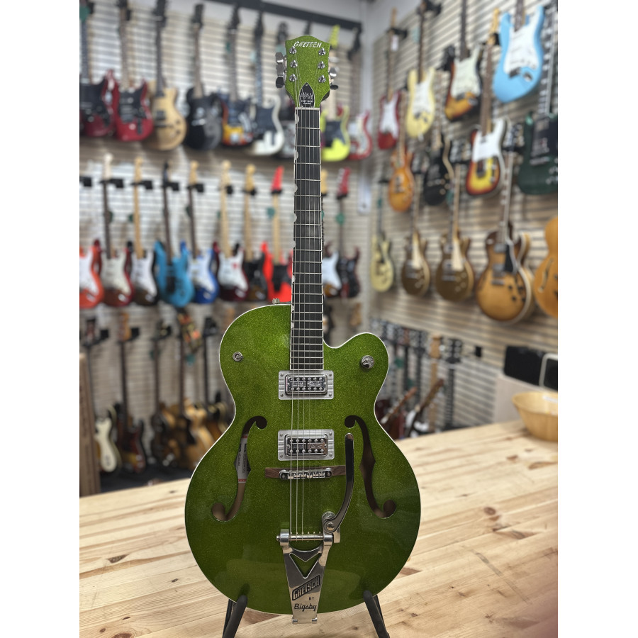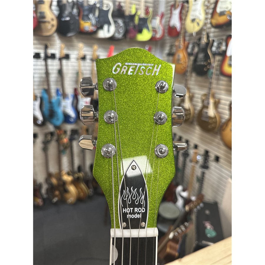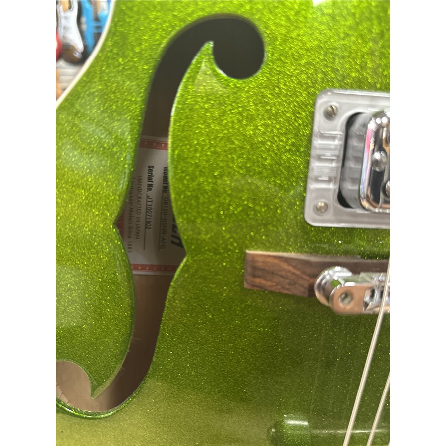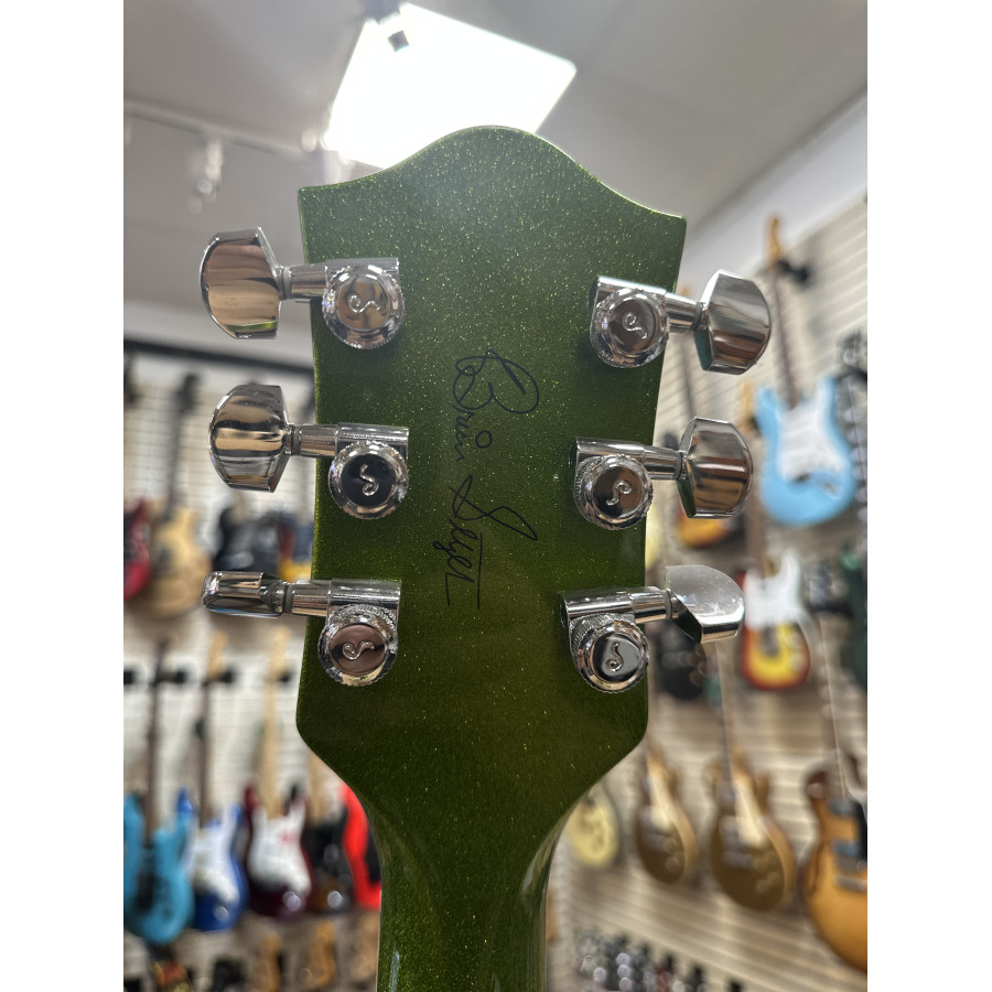 Nu finns chansen att lägga vantarna på en Gretsch 6120 BSHR-AFG Brian Setzer Hot Rod i den spektakulära färgen Extreme Coolant Green. Tillverkad 2015, med serienummer JT15071902, och i mint condition – praktiskt taget som ny.