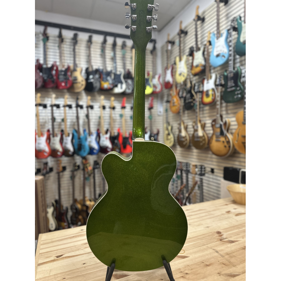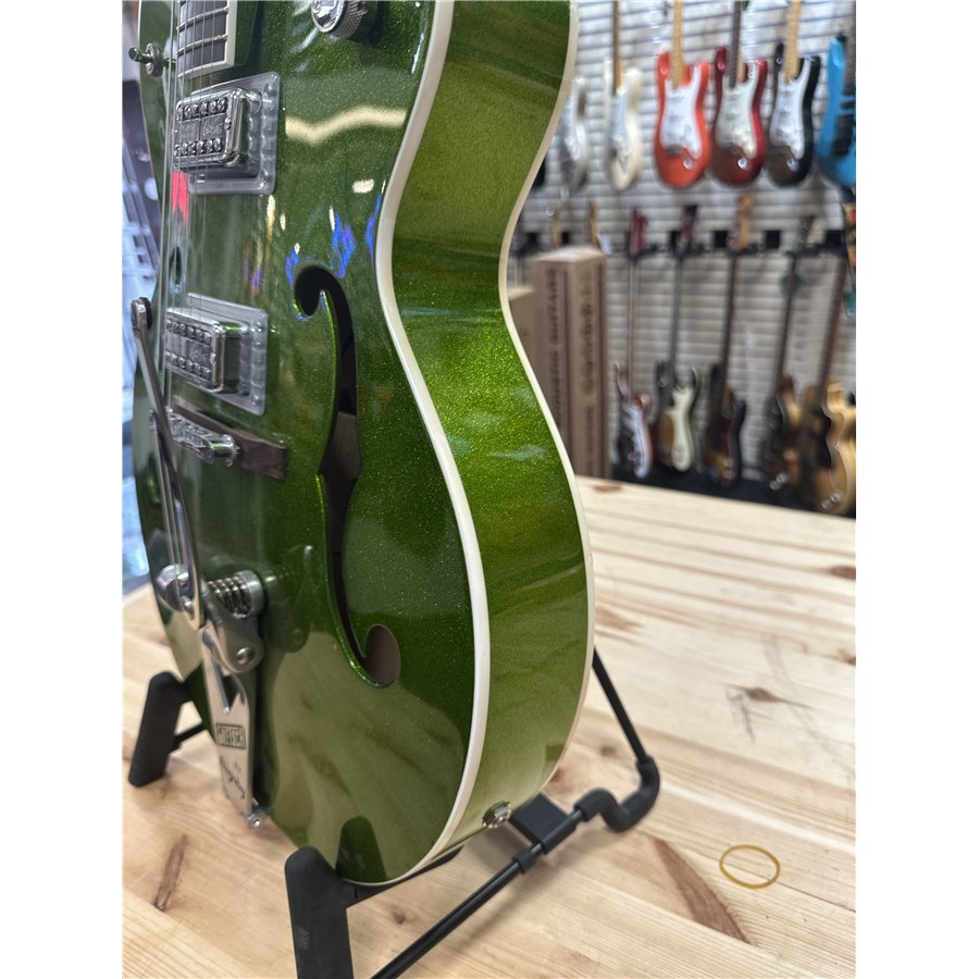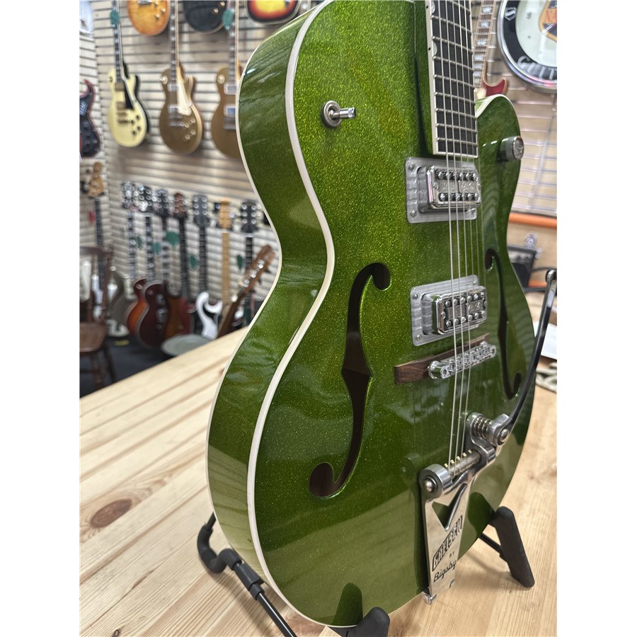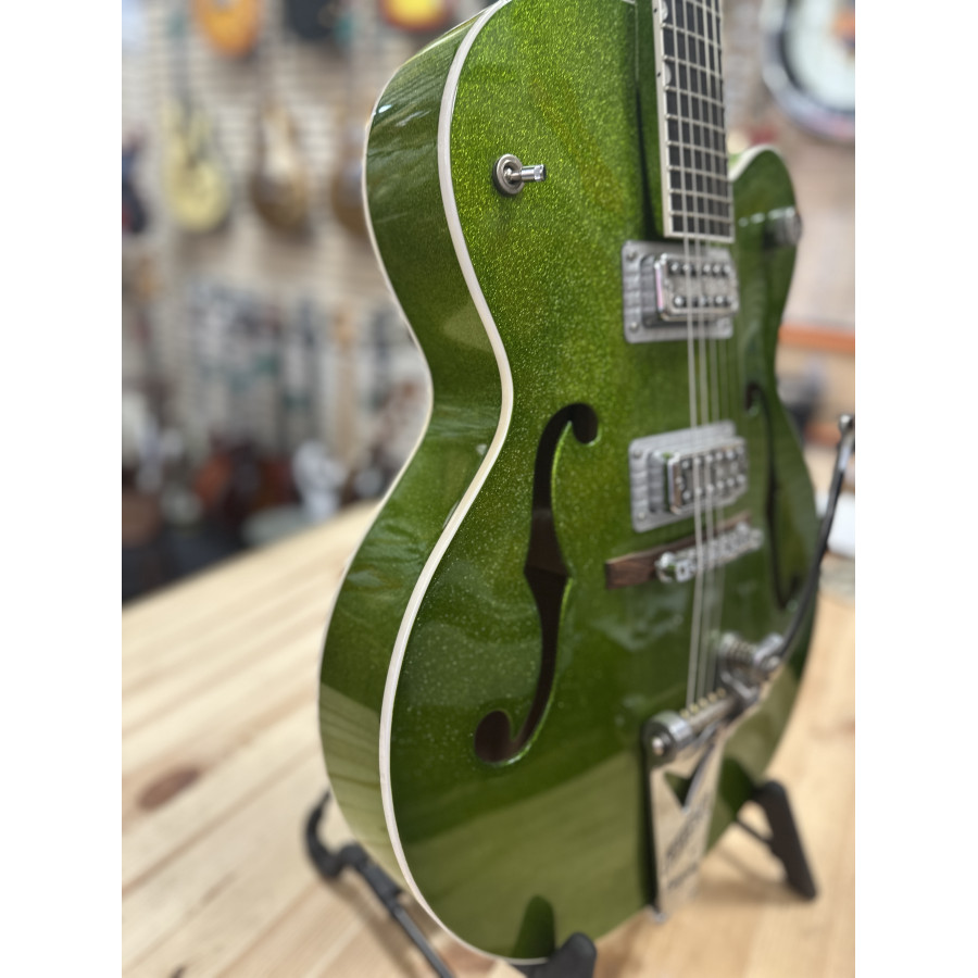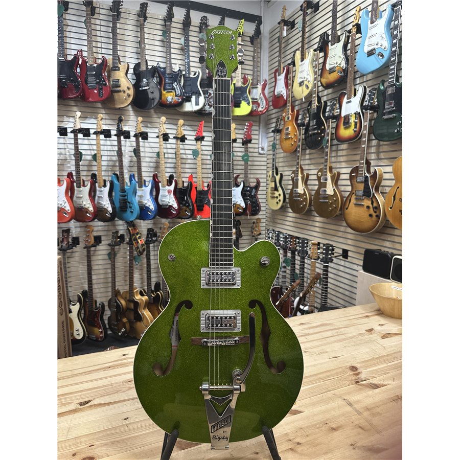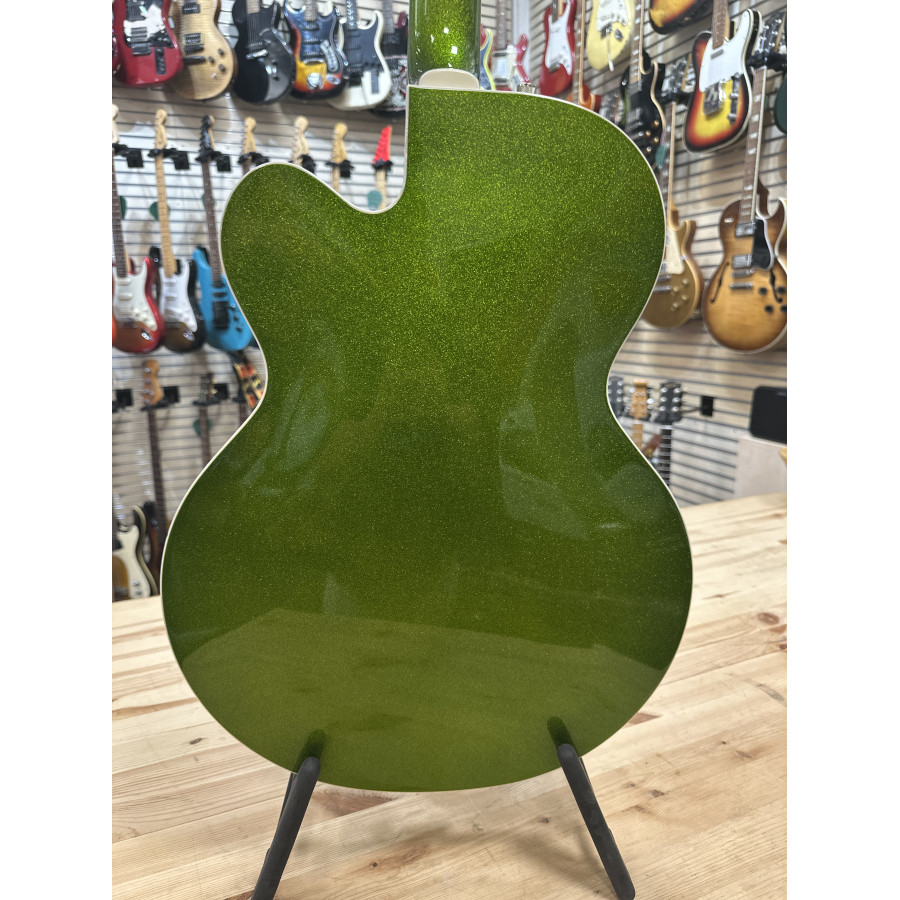 Nu finns chansen att lägga vantarna på en Gretsch 6120 BSHR-AFG Brian Setzer Hot Rod i den spektakulära färgen Extreme Coolant Green. Tillverkad 2015, med serienummer JT15071902, och i mint condition – praktiskt taget som ny.