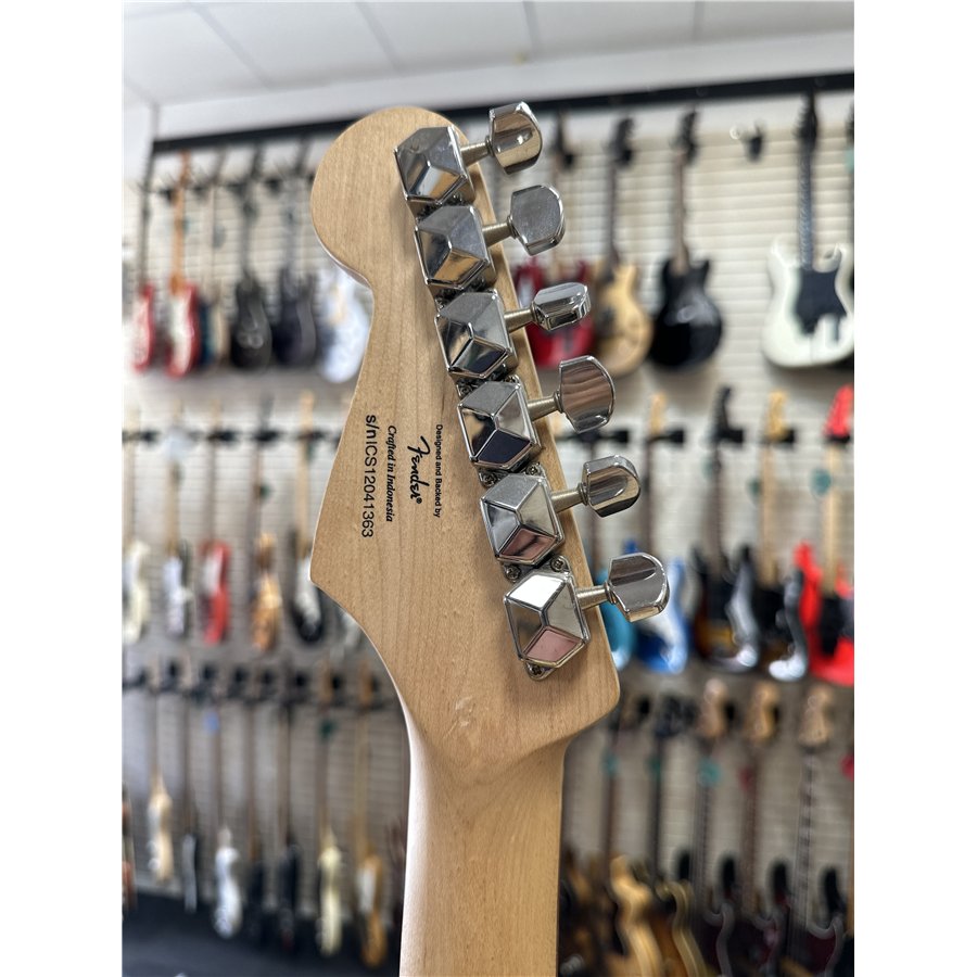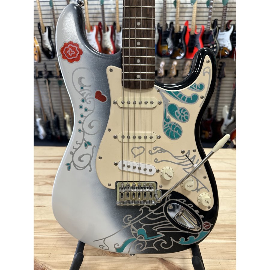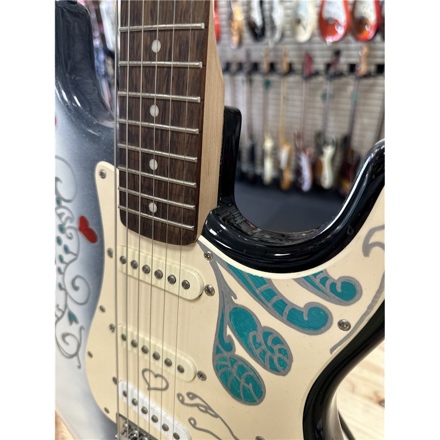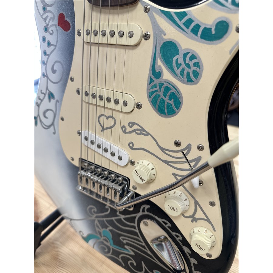 Modellen är ursprungligen en Squier Stratocaster (Made in Indonesia) som fått denna speciella Midnight Monterey-finish inspirerad av Hendrix legendariska Stratocaster.